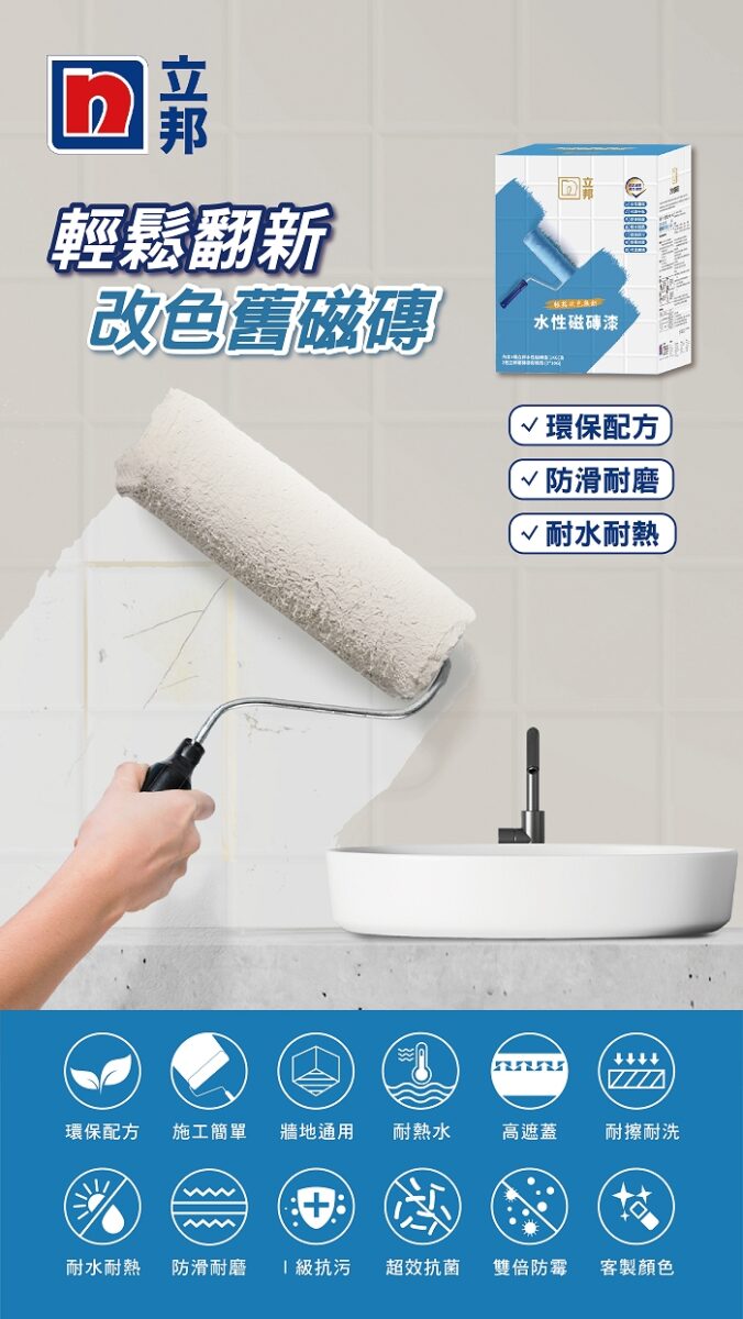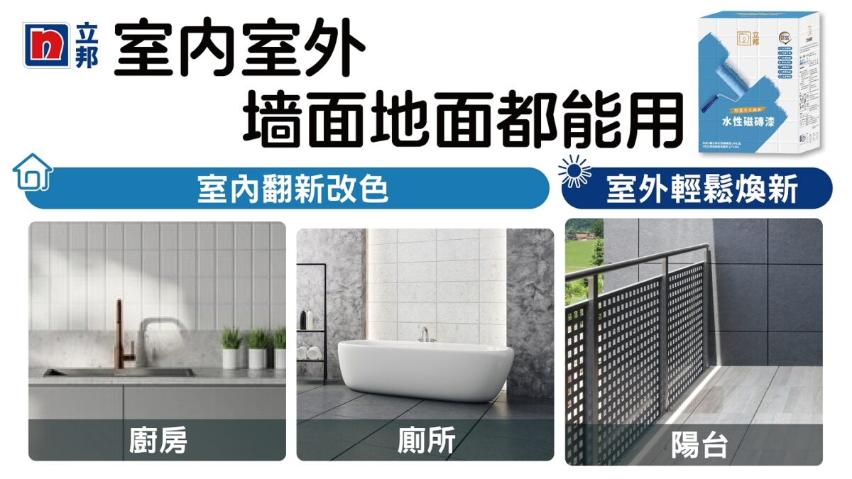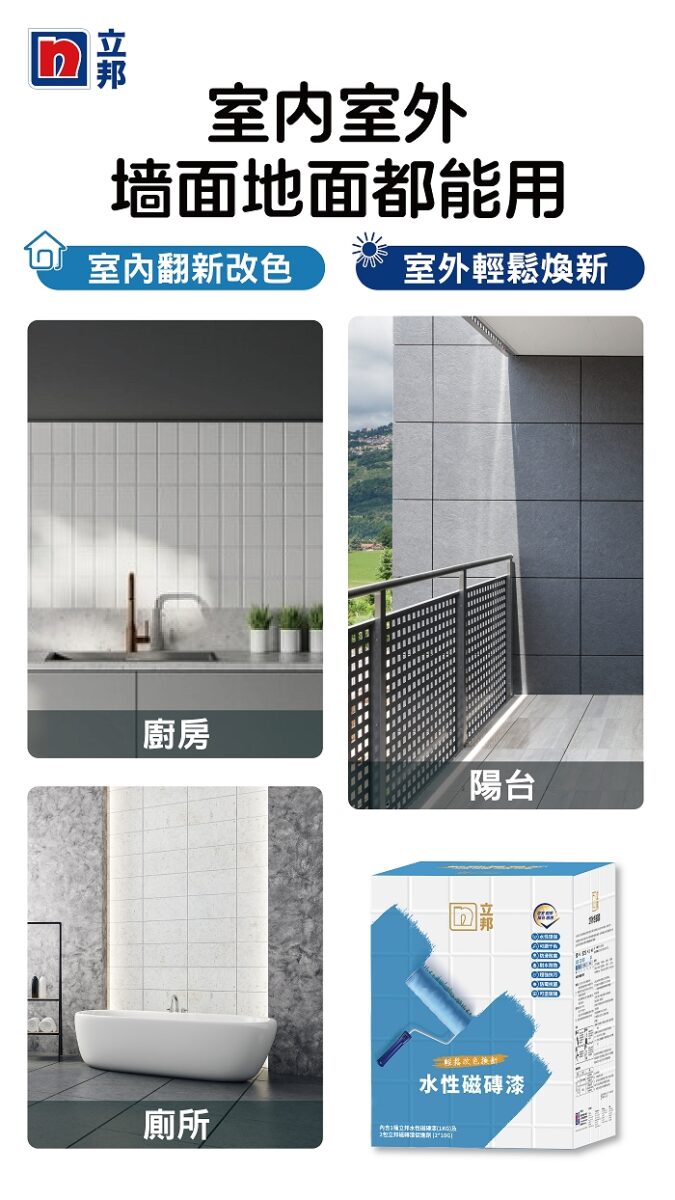 立邦水性磁磚漆通過96h耐水、1小時耐沸水、1小時耐酒精擦拭與耐紫外線照射老化的嚴苛測試,適用多種場景,廚房、廁所、陽臺等場景皆適用,牆面、地面與陽臺瓷磚、玻璃、木造廚櫃等皆適用,施工簡單快速,新手也能快速上手。(*註:木地板請勿使用)